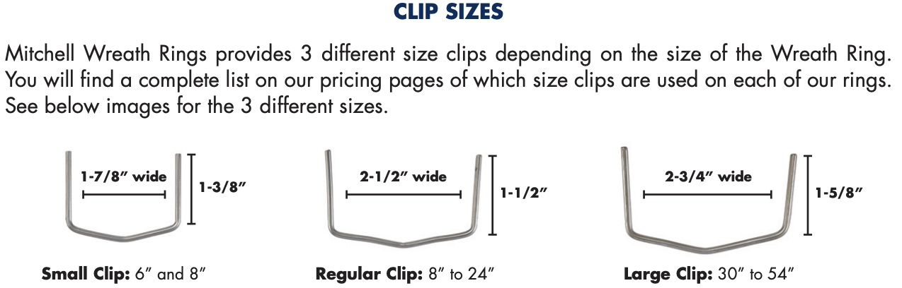 A diagram depicting wreath ring clip sizes, with width and height figures.