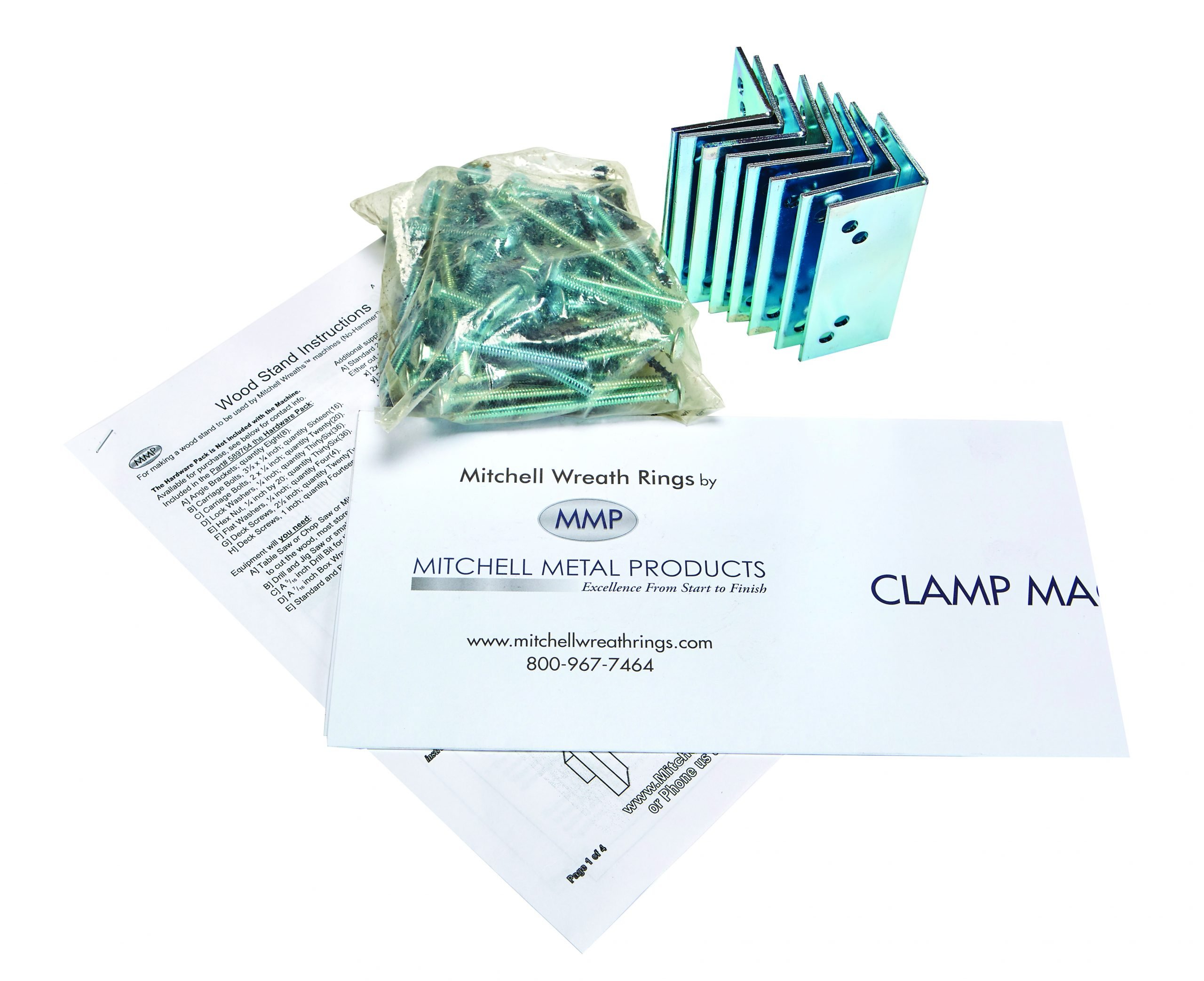 Instructions, corner brackets, carriage bolts, washers, nuts and wood screws needed to build your own wooden stand. Hardware allows fitting of any Mitchell clamp machine into a wood stand you build to specifications supplied with the hardware pack.